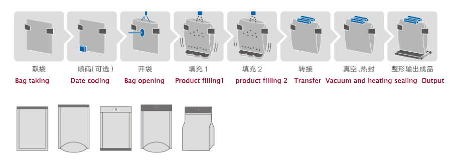 कार्यप्रवाह: झोला → मुद्रण उत्पादन मिति → खोल्ने झोला → भर्ने 1 → भर्ने 2 → खाली स्थान → तातो सील → आकार र आउटपुट