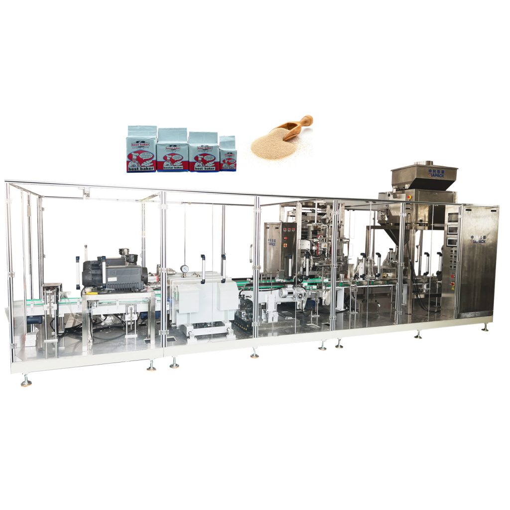 सुक्खा खमीर खुवाउनको लागि एक सेट ZK3 भ्याकुम लिफ्ट सहित यो मेसिन, एक सेट ZL520 ठाडो झोला प्याकिङ र सिल गर्ने मेसिन। एक सेट ZLC4-2000 चार बाल्टिन तौल गर्ने मेसिन, एक सेट ZL-100V2 डबल भ्याकुम च्याम्बर प्याकिङ मेसिन। यो मेसिन व्यापक रूपमा पाउडर वा सानो दाना मा खाद्य फार्मेसी रसायन र अन्य उत्पादन प्याकिङ लागि प्रयोग गरिन्छ। जस्तै कफी पाउडर, खमीर पाउडर गहुँको पीठो र यस्तै। पूरै मेसिन भित्र पम्पिंग गर्न भ्याकुम उत्पादन। भ्याकुम डिग्री धेरै उच्च छ र प्याकिङ गति धेरै उच्च छ 30bag/min पुग्न सकिन्छ .समाप्त उत्पादन एक लामो शेल्फ जीवन र सुन्दर आकार छ .